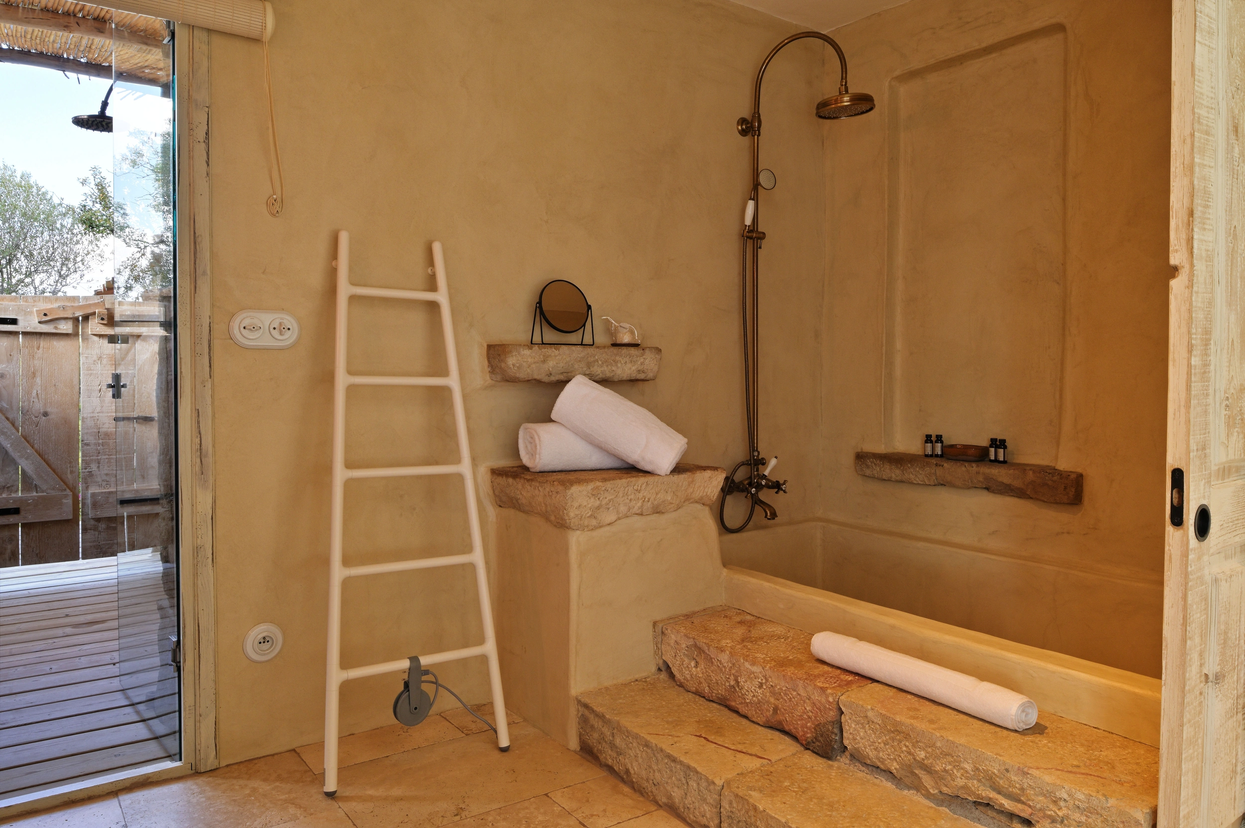 Each shepherd house features a fully equipped kitchen: induction cooktop, oven, dishwasher, Nespresso machine, kettle, and toaster. For your comfort, you will also find air conditioning, Wi-Fi, a safe, and a laundry area with a washing machine. Outside, enjoy your private heated pool, a premium plancha grill, and sun loungers for complete relaxation.
